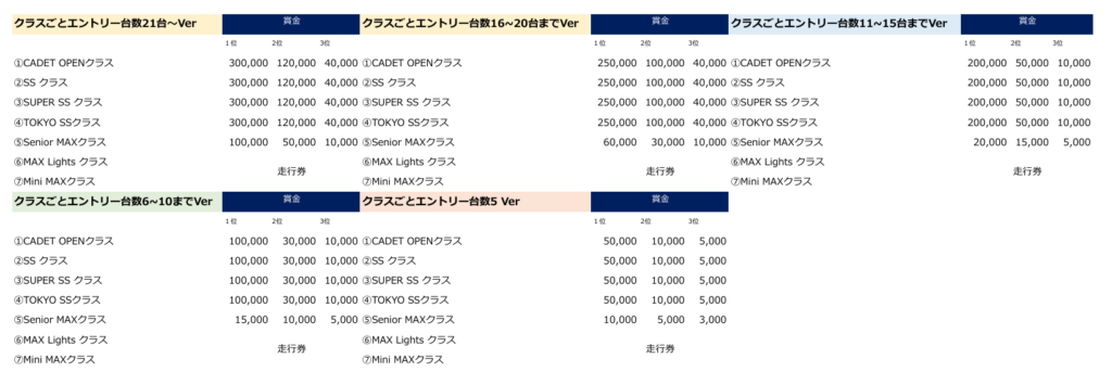 開催クラスごとの賞金内訳は添付の下記の表をご確認ください。
